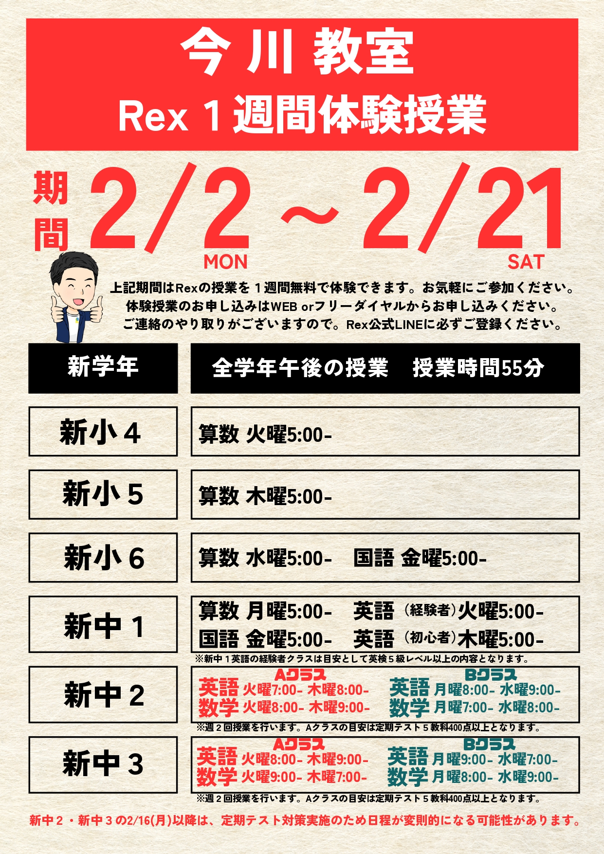 ホームページをご覧くださり、ありがとうございます。進学塾Rex今川教室 教室長の外戸です。 進学塾Rex今川教室が2021春、開校。今川教室はRexの5教室目として誕生。今川2丁目の交差点にある、黄色のとても存在感のある教室です。 教室はとてもきれいで、自習ブースもたくさんあり、学力向上にもってこいの教室です。先生が常駐しているので、わからないことがあればなんでも質問してください。 また、Rexは英検®取得にも力を入れており、開校初年度でたくさんの生徒が2級合格をはじめ、難関を突破してきました。 進学塾Rexは「学びたい!」を育む、どこよりも「近い」進学塾として、天王寺高校・三国丘高校・高津高校・生野高校・住吉高校進学を目指し、高校受験に向けたきめ細かい指導を実践していきます。 白鷺中学校、東住吉中学校・中野中学校・平野中学校・平野北中学校地域の小・中学生のみなさん、Rexの熱い授業をご期待ください。